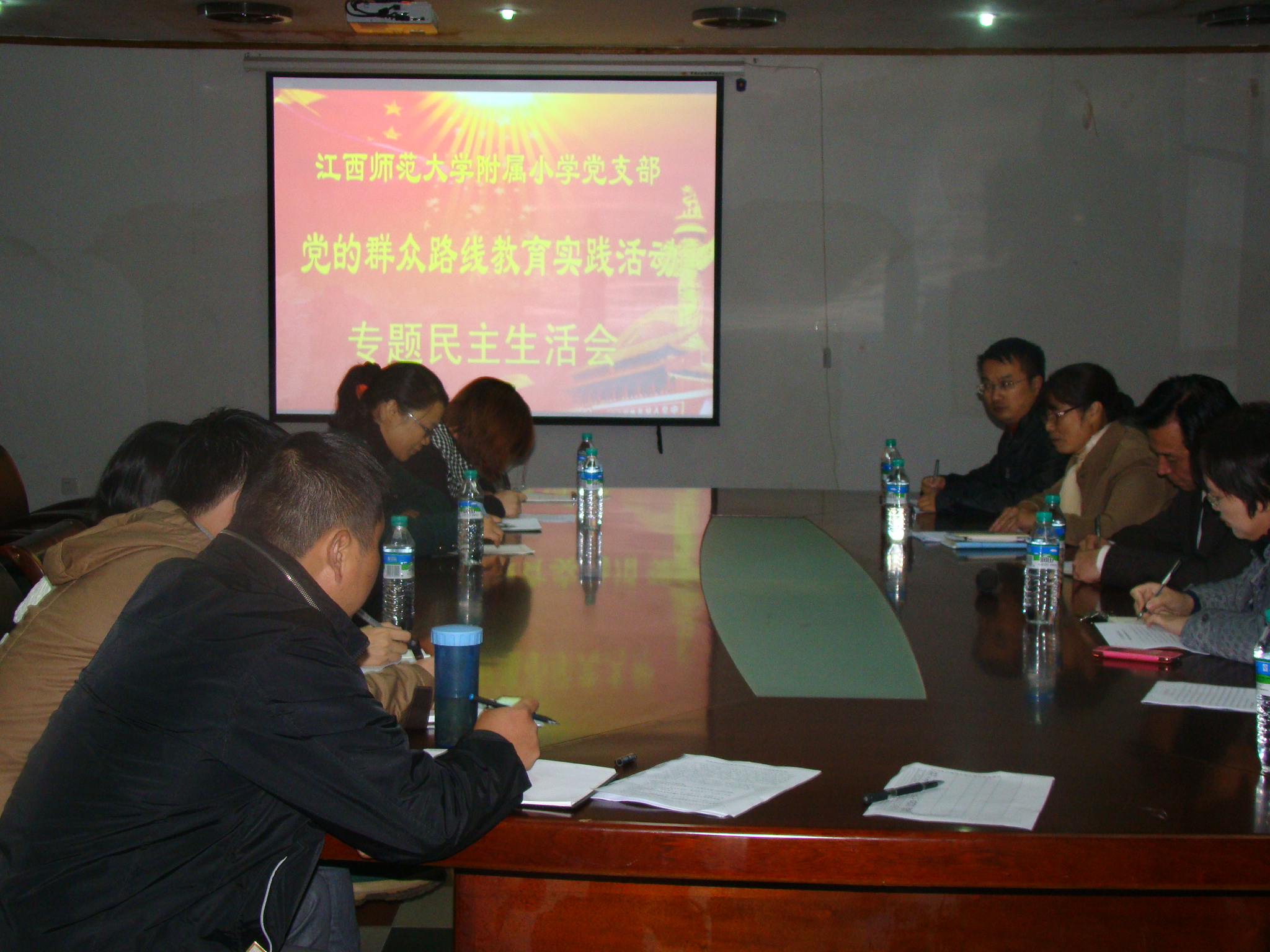 会上,周剑萍同志首先介绍了附小党支部党的群众路线教育实践活动的开展与专题民主生活会的筹备情况,说明了本次专题民主生活的会议议程,强调会议要求。随后全体党员集中学习观看了习近平同志指导河北省委常委班子专题民主生活会的《焦点访谈》、《新闻联播》报道视频和强卫书记指导省委省政府信访局专题民主生活会的新闻专题片。学习结束后,行政班子成员面对全体党员和群众代表逐一作对照检查,紧紧围绕自身存在的“四风”问题作深刻的剖析和自我批评,并认真听取班子其他成员和群众的批评意见。随后全体党员之间也开展了批评与自我批评活动。