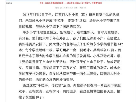 据悉,本次活动是班级家委会组织联系,得到了广大家长的支持和赞许,南昌高新区教育信息网上对本次拉手学雷锋活动进行了报道,表示了肯定。
