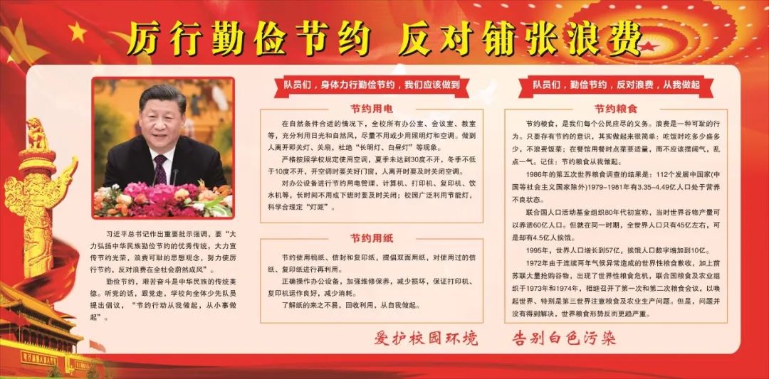 倡议一发出,全校师生立即采取行动,从自己做起,和家人一起,从一餐一饭开始,开展了设计张贴创意手抄报,饭后光盘不剩菜、记录身边节俭好人好事、写读后感等活动,用实际行动向身边人宣传厉行节约、杜绝浪费知识内容。