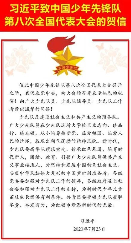 习近平总书记在中国少年先锋队第八次全国代表大会召开之际发来贺信:少先队是建设社会主义和共产主义的预备队。广大少先队员在少先队这所大学校里立志向、修品行、练本领,从小培养热爱党、热爱祖国、热爱人民的情怀,展现出朝气蓬勃的精神风貌。