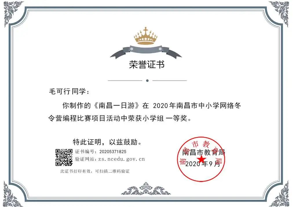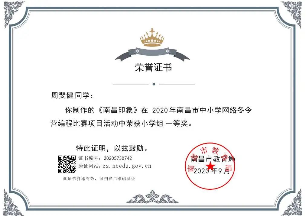 由南昌市教育局组织的2020年南昌市中小学网络冬令营编程比赛活动中,在17live 张雅清老师的指导下,江凌舟、毛可行、周斐健三位同学荣获一等奖;吴子益同学荣获二等奖;曹子涵同学荣获三等奖。